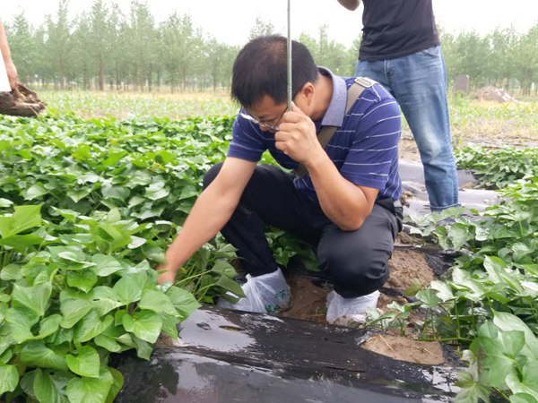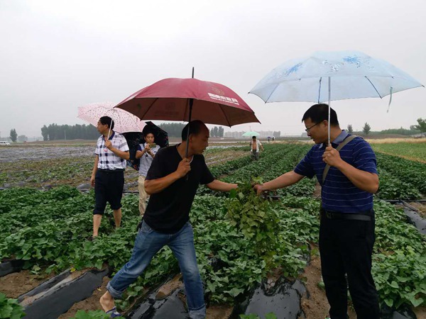 2017年6月22日,河北省農(nóng)科院糧油作物研究所甘薯室主任、京津冀甘薯聯(lián)合鑒定試驗負責人馬志民冒雨到禾下土甘薯新品種試驗基地調研,邯鄲市禾下土種業(yè)有限公司總經(jīng)理崔伏喜陪同參觀。