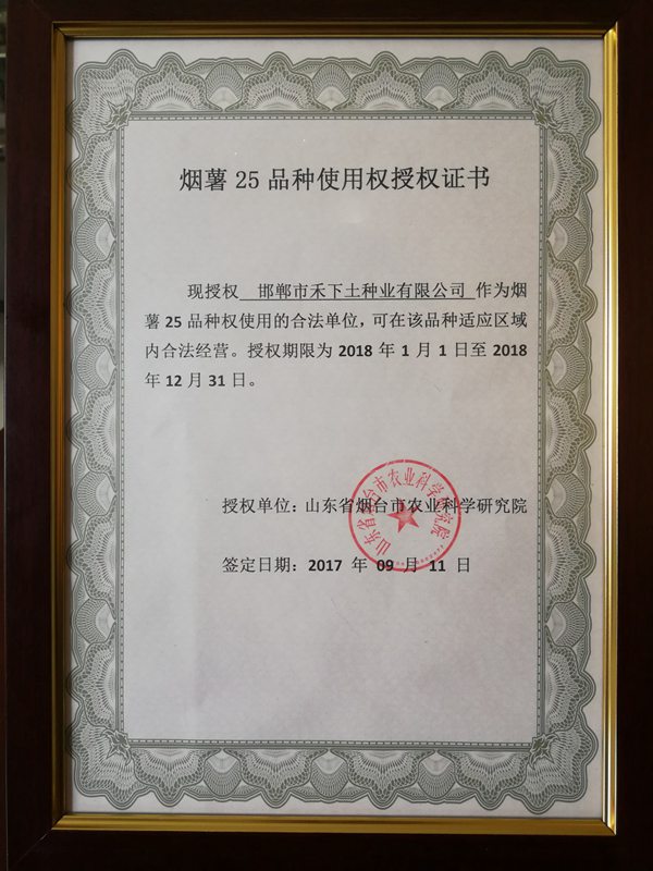 2017年9月11日,邯鄲市禾下土種業(yè)有限公司與煙臺市農業(yè)科學院在山東煙臺簽定"煙薯25"甘薯品種使用權許可合同,有效日期15年。