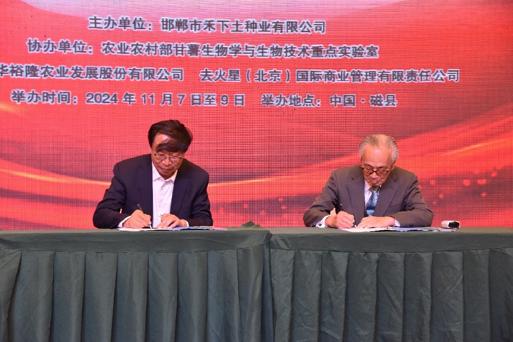 為深化中日韓企業(yè)在甘薯產業(yè)領域交流合作,建立更緊密的伙伴關系,助力甘薯企業(yè)發(fā)展壯大,推動甘薯產業(yè)蓬勃發(fā)展。2024年11月8日,在第十二屆東亞甘薯國際研討會會議現場,隆重舉行了中日韓企業(yè)代表簽約儀式。在此重要時刻,邯鄲市禾下土種業(yè)有限公司分別與日本東亞紅薯友好協(xié)會、韓國農業(yè)法人 HortFarm簽訂合作協(xié)議。天津豐華裕隆農業(yè)發(fā)展股份有限公司與韓國幸福紅薯簽訂合作協(xié)議。此次簽約,不僅標志著簽約各方在甘薯育種、良繁、無毒栽培、加工、市場開發(fā)等多維度建立更緊密的聯系,更預示著東亞地區(qū)甘薯產業(yè)將迎來更加廣闊的合作前景與發(fā)展機遇。