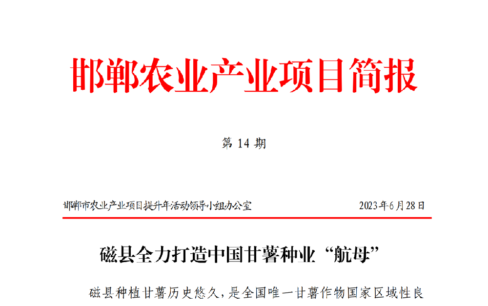 2023年6月28日,邯鄲市農(nóng)業(yè)產(chǎn)業(yè)項目提升年活動領導小組辦公室發(fā)布第14期《邯鄲農(nóng)業(yè)產(chǎn)業(yè)項目簡報》磁縣全力打造中國甘薯種業(yè)“航母”。