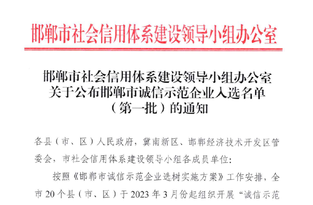 2023年6月26日,邯鄲市社會信用體系建設領導小組辦公室公布“邯鄲市誠信示范企業(yè)入選名單(第一批)”,邯鄲市禾下土種業(yè)有限公司等348家企業(yè)入選邯鄲市“誠信示范企業(yè)”。