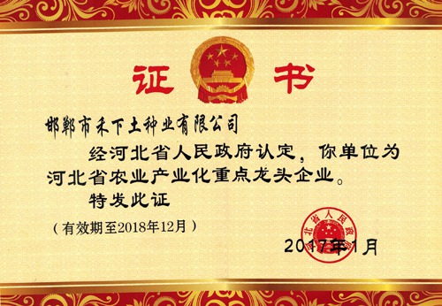 2017年邯鄲市禾下土種業(yè)有限公司被河北省人民政府授予河北省農(nóng)業(yè)產(chǎn)業(yè)化重點龍頭企業(yè),此項榮譽是河北省人民政府對禾下土種業(yè)長期以來在農(nóng)業(yè)科研、技術(shù)創(chuàng)新、產(chǎn)業(yè)化發(fā)展、服務(wù)帶動等方面給予的充分肯定,也進一步堅定了禾下土加快農(nóng)業(yè)產(chǎn)業(yè)化發(fā)展的信心與步伐。禾下土種業(yè)自2002年成立以來,發(fā)展了脫毒甘薯、小麥良種繁育、磁州白蓮藕三大農(nóng)業(yè)產(chǎn)業(yè)、建立了三個規(guī)?;F(xiàn)代農(nóng)業(yè)示范基地。其中,以脫毒甘薯產(chǎn)業(yè)為核心,建立起1個現(xiàn)代化脫毒組培擴繁中心、1000畝脫毒甘薯種薯生產(chǎn)基地、500畝脫毒甘薯種苗繁育基地、10000畝脫毒甘薯高產(chǎn)示范基地。已完成26個甘薯品種的脫毒組培,制定了二十余項標(biāo)準(zhǔn)生產(chǎn)操作規(guī)程和4項專利申請,實現(xiàn)了集科研、育種、育苗、生產(chǎn)、儲藏、銷售的一體化發(fā)展目標(biāo)。年產(chǎn)高代脫毒種苗2.5億株,營銷網(wǎng)絡(luò)覆蓋河北、河...