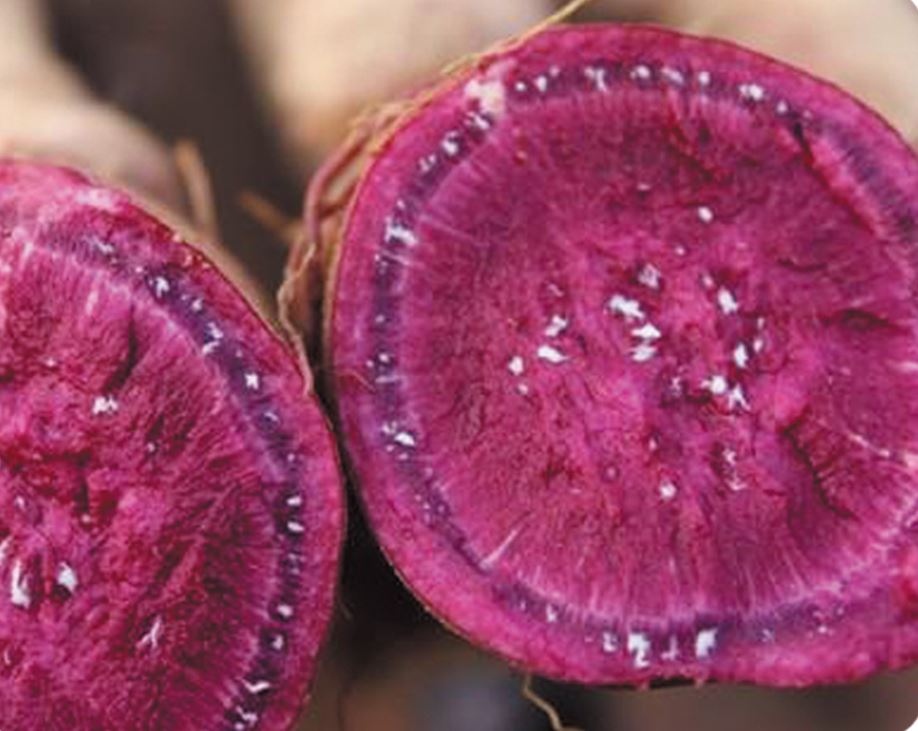 紫菁二號① 特征特性:該品種是目前國內少有的綜合性狀的紫肉薯,高抗根腐病,抗莖線蟲病,較抗黑斑病。薯皮紫色,薯肉深紫色,色澤均勻。② 品種來源:由河南農科院自德國引入,俗稱"德黑"。③ 產量表現:一般畝產春薯4000~5000斤,夏薯3000斤左右。④ 栽培要點:⑴培育壯苗,采用秋薯留種。⑵施足基肥,早追苗肥,重施"夾邊肥",后期看莖葉生長情況酌情追施"裂縫肥"或根外追肥。⑶適期早插合理密植。春薯每畝植3000株,夏薯每畝植3500株⑷適應性廣,耐旱耐澇耐肥,管理省工,莖節(jié)不定根少。不需翻秧,注意防治蟲害。⑸適時收獲。⑤ 市場前景:該品種具花青素含量高,色澤高貴艷麗,口味上佳,用途廣泛,可加工色素、薯泥、薯脯、全粉等;其屬葉蔓尖也可開發(fā)高檔的精品蔬菜!