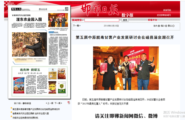2018年1月8日,第五屆中原脫毒甘薯產(chǎn)業(yè)發(fā)展研討會在河北磁縣溢泉湖隆重舉行。得到各大報紙、網(wǎng)絡(luò)媒體的關(guān)注。本次研討會特別邀請國家甘薯產(chǎn)業(yè)技術(shù)體系首席專家馬代夫、山東省煙臺市農(nóng)科院甘薯研究所所長、煙薯25育種人辛國勝、河北省農(nóng)林科學(xué)院糧油作物研究所主任馬志民、龍薯9號育種人楊立明,及來自國內(nèi)24個省市的優(yōu)秀甘薯種植戶、育苗單位、農(nóng)資企業(yè)、機械廠家、甘薯加工、銷售企業(yè)代表共300余人出席參加。為國內(nèi)甘薯企業(yè)、種植戶在種苗培育、品種選擇、安全生產(chǎn)、貯藏銷售、精深加工、產(chǎn)業(yè)合作等方面創(chuàng)新了發(fā)展新思路,為進(jìn)一步加快脫毒甘薯產(chǎn)業(yè)化推廣,推動中國脫毒甘薯產(chǎn)業(yè)的健康發(fā)展發(fā)揮了重要的作用。