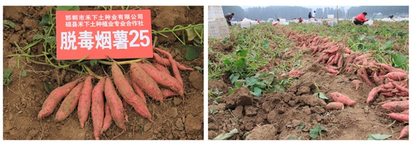 國家生產試驗:鮮薯產量在寶雞、濟寧、石家莊三個試點均比對照增產,平均鮮薯產量2382.0Kg/畝,比對照徐薯22增產8.58%;平均烘干率27.04%,比對照低4.02個百分點;平均淀粉率17.16%,比對照低3.50個百分點。
