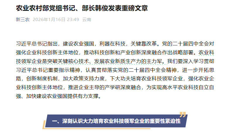 近日,《農(nóng)村工作通訊》2025年第24期刊發(fā)農(nóng)業(yè)農(nóng)村部黨組書記、部長韓俊重磅文章《大力培育農(nóng)業(yè)科技領(lǐng)軍企業(yè)》。文章深入闡釋了培育農(nóng)業(yè)科技領(lǐng)軍企業(yè)、強化企業(yè)科技創(chuàng)新主體地位的重要意義與實踐路徑,為農(nóng)業(yè)科技企業(yè)高質(zhì)量發(fā)展指明方向、提供遵循。現(xiàn)將全文轉(zhuǎn)發(fā)如下:習近平總書記指出,建設(shè)農(nóng)業(yè)強國,利器在科技,關(guān)鍵靠改革。黨的二十屆四中全會對強化企業(yè)科技創(chuàng)新主體地位,推動科技創(chuàng)新和產(chǎn)業(yè)創(chuàng)新深度融合作出戰(zhàn)略部署。農(nóng)業(yè)科技領(lǐng)軍企業(yè)是突破關(guān)鍵核心技術(shù)、發(fā)展農(nóng)業(yè)新質(zhì)生產(chǎn)力的主力軍。我們要深入學(xué)習貫徹習近平總書記重要指示精神,認真貫徹落實黨的二十屆四中全會精神,進一步開拓思路,創(chuàng)新制度機制,加大政策支持力度,下大功夫培育農(nóng)業(yè)科技領(lǐng)軍企業(yè),強化農(nóng)業(yè)企業(yè)科技創(chuàng)新主體地位,推進企業(yè)主導(dǎo)的產(chǎn)學(xué)研深度融合,為實...