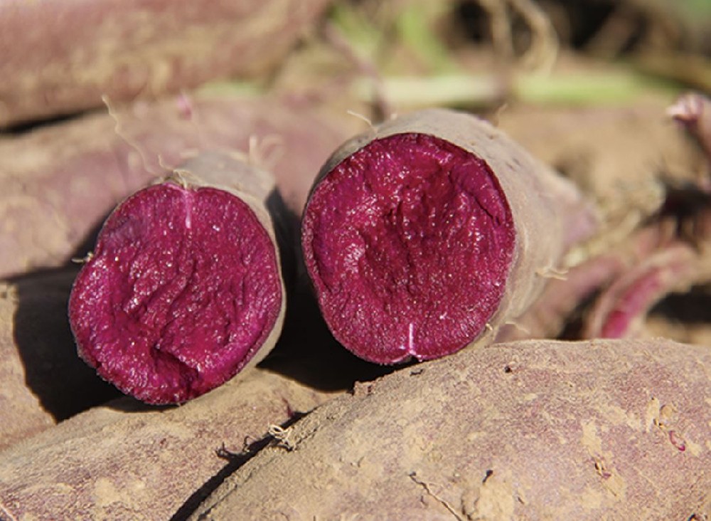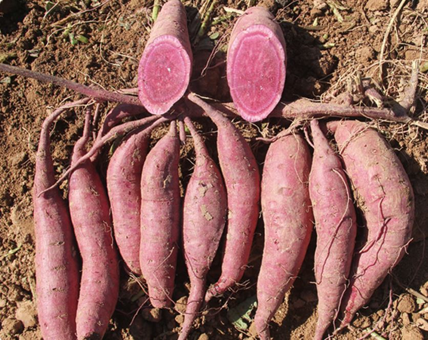 鮮食型甘薯品種,中長薯,數(shù)塊條形,薯皮紫紅色,薯肉紫色,結(jié)薯集中整齊,干物率33.44%,鮮薯花青素含量為20.46mg/100g。抗甘薯蔓割病、根腐病、黑斑病,耐儲(chǔ)存性好。一般畝產(chǎn)鮮薯2000公斤左右。